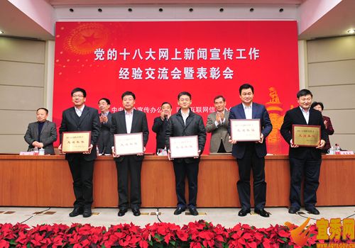会议对十八大互联网新闻宣传先进集体和个人进行了表彰,安徽省互联网宣传管理办公室、北京市互联网信息办公室等11个单位被评为先进集体,人民网、新华网、中国网络电视台、千龙网、东方网等21家新闻网站和新浪网、百度网、腾讯网等6家商业网站被评为先进网站,安徽省互联网宣传管理办公室陈向民、中安在线杨玥玥等90名个人被评为先进个人。