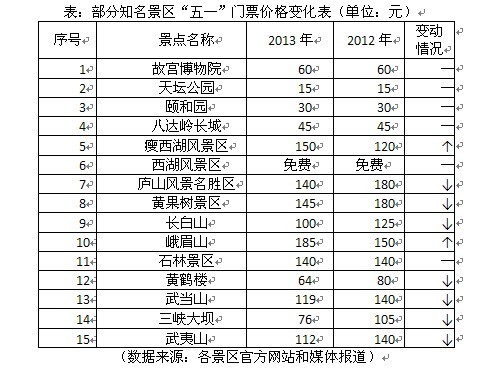 截至目前,今年全国已有11个省市宣布在五一假期或五一前后下调门票价格,涉及景区千余个,其中包括江西庐山、贵州黄果树、吉林长白山、云南石林景区、福建武夷山等知名景区。同时,西湖的免票时代也走入了第十一个年头,“西湖模式”被传为佳话。北京的故宫、天坛、颐和园、八达岭等景区自2009年至今一直维持着统一票价。