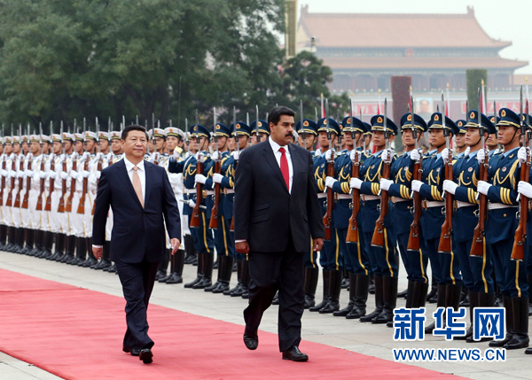 会谈前,习近平在人民大会堂东门外广场为马杜罗举行欢迎仪式。习近平主席夫人彭丽媛、全国人大常委会副委员长艾力更·依明巴海、国务委员杨洁篪、全国政协副主席刘晓峰等出席。