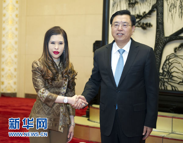 12月10日,全国人大常委会委员长张德江在北京人民大会堂会见来华出席第6届“中泰一家亲”音乐歌舞晚会的泰国朱拉蓬公主。新华社记者谢环驰摄