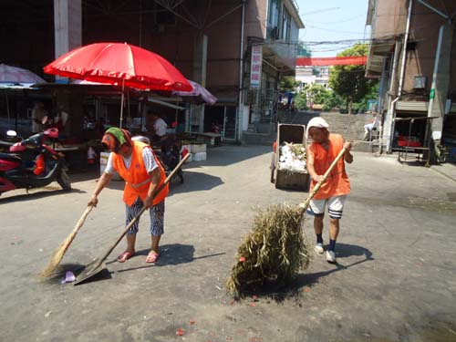 在圣埠菜市场,该区大桥街道芭茅社区的工作人员和环卫工人一起动于清扫市场里的各种瓜果皮壳等。现场的环卫人员告诉我们,为了进一步营造良好市场经营环境,他们今天早上6点就来到菜市场清扫垃圾,两个人已经清除了五、六板车的垃圾啦!就这样许多经营户仍些不自觉,经常是这边环卫工人刚才扫干净,那边又有小摊贩又乱扔剥开的豆壳。芭茅巷社区党支部委员任祥金告诉我们,芭茅巷社区在对菜市场加大清扫保洁力度的同时,进一步规范管理秩序,对市场内的经营进行科学化分并且严格管理负责落实“三包”,并对一些不自觉的摊贩加大处罚力度,多管齐下整顿菜市场的秩序和环境。
