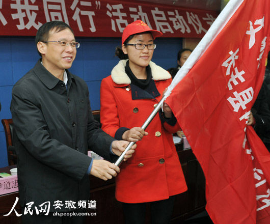 在合肥市长丰县“文明上网、你我同行”活动启动仪式上,安徽省互联网宣传管理办公室主任章理中为该县文明上网志愿者授旗。