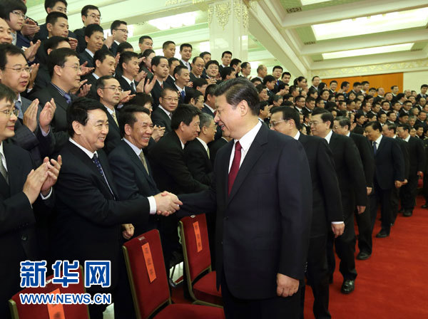 1月6日,党和国家领导人习近平、李克强、张德江、俞正声、刘云山、王岐山、张高丽等在北京人民大会堂会见探月工程嫦娥三号任务参研参试人员代表。新华社记者 兰红光 摄
