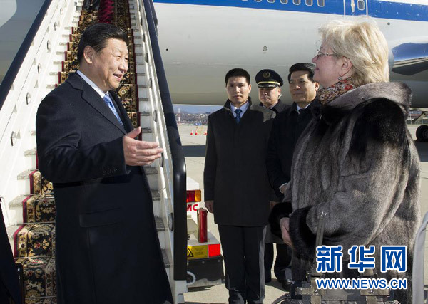 当地时间13时50分许,习近平乘坐的专机抵达索契阿德列尔机场。习近平受到索契市负责人的欢迎。