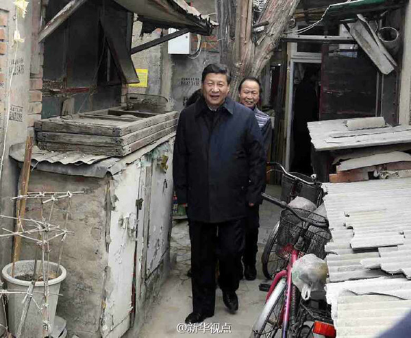 新华网北京2月25日电 据新华社“新华视点”微博报道,雨儿胡同29号、30号是北京典型的大杂院,院里都是小平房,过道狭窄。“做饭烧什么?”“取暖方便不方便?”“胡同里几个厕所?”总书记走进王云凤等4户人家,问冷暖,听心愿。在北京老城区长大的习近平说,这一片胡同我很熟悉,今天来看看老街坊,了解大家实际生活情况。