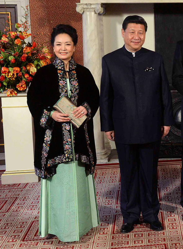 ——在出席威廉-亚历山大国王举行的国宴时,习主席与夫人彭丽媛都以中式服装亮相。习主席穿着的中式服装色彩饱和,略带暗光泽,颇具庄严感;高密度高支纱的面料让人感觉严谨与厚重;在设计上,暗门襟的设计将前胸的纽扣都隐藏起来,沉稳大气,淡去人们对于中山装的记忆。颇具巧思的是左前胸呼应西装口袋巾的图案设计,体现出对西方礼仪的尊重,也营造出轻松和谐的氛围。彭丽媛穿着的是牡丹花刺绣的外套,内搭粉果绿的长裙,长裙很具有清新感,内藏着对绿色环保的崇尚。中国刺绣素来被西方人所崇尚,牡丹花自古被视为中国的国花,颇具传统风格的粉果绿色彩,给人以清新感,同时内藏对绿色环保的崇尚。整套服装具有很鲜明的中国特色,非常符合中国人的审美观,又符合西方时尚,并且廓形感很强。