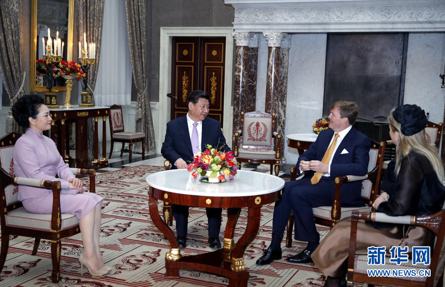 3月22日,国家主席习近平在阿姆斯特丹会见荷兰国王威廉-亚历山大。当习近平和夫人彭丽媛抵达王宫时,威廉-亚历山大国王和马克西玛王后热情迎接。双方进行了亲切友好的交谈。资料图