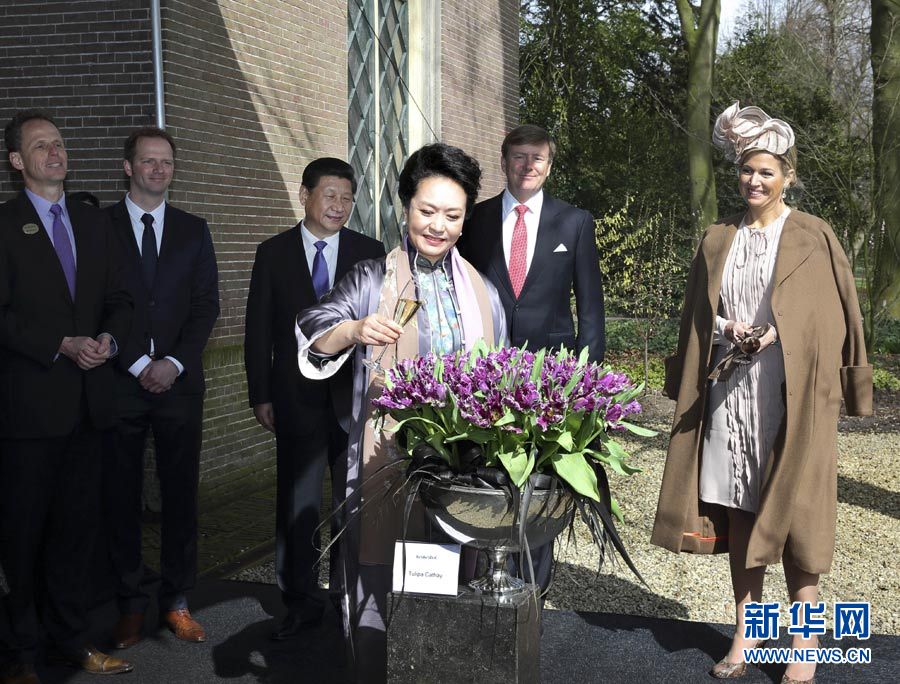 3月23日,中国国家主席习近平和夫人彭丽媛在荷兰国王威廉-亚历山大和马克西玛王后陪同下参观中荷农业合作和荷兰郁金香花展。彭丽媛应邀将新培育的郁金香命名为“国泰”,并按当地传统浇上香槟。资料图