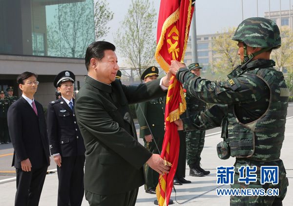 4月9日,中共中央总书记、国家主席、中央军委主席习近平视察中国人民武装警察部队特种警察学院并为“猎鹰突击队”授旗。这是习近平将队旗郑重授予“猎鹰突击队”大队长。新华社记者 李刚 摄