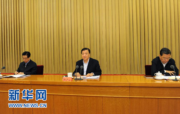 4月18日,中共中央政治局常委、中央书记处书记、中央党的群众路线教育实践活动领导小组组长刘云山在北京出席部委企业高校深化整改工作座谈会并讲话。新华社记者 饶爱民 摄