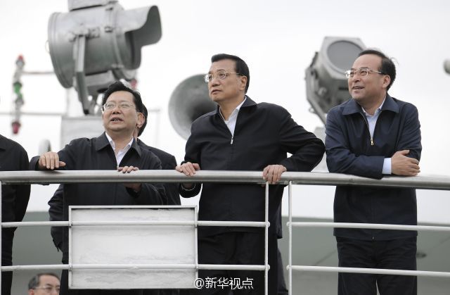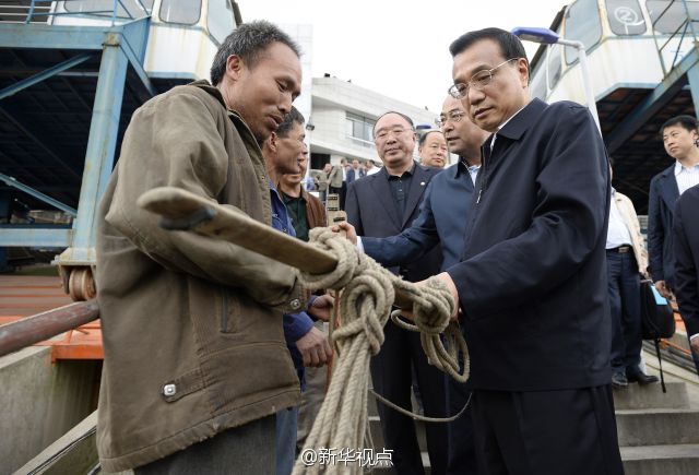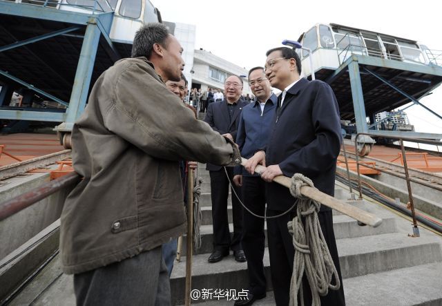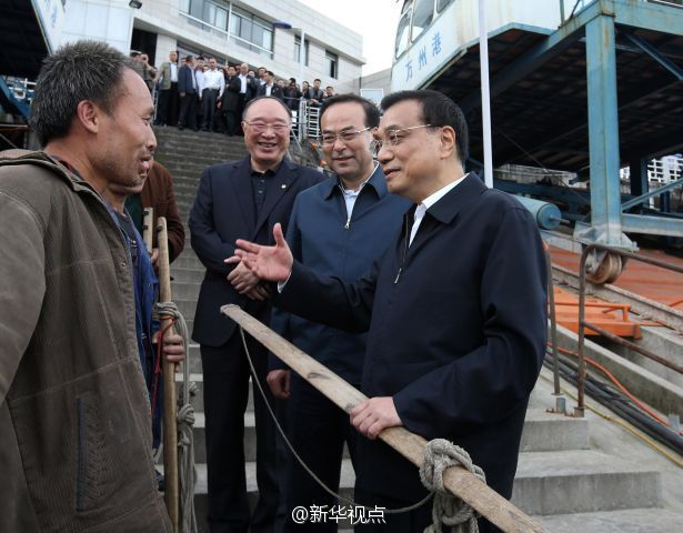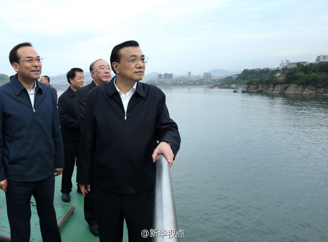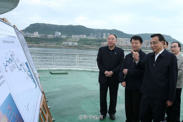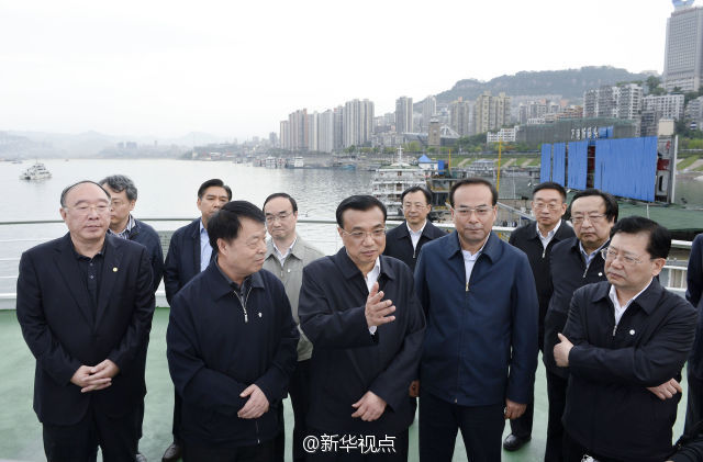 李克强总理27日在重庆万州港乘船考察长江黄金水道。他来到轮船甲板上,认真观察港口基础设施和航道建设现状,与有关部门负责人共商长江黄金水道未来发展大计。李克强说,长江黄金水道是贯通东中西部、通航能力最强的航道,要用黄金水道串起长江经济带“珍珠链”。