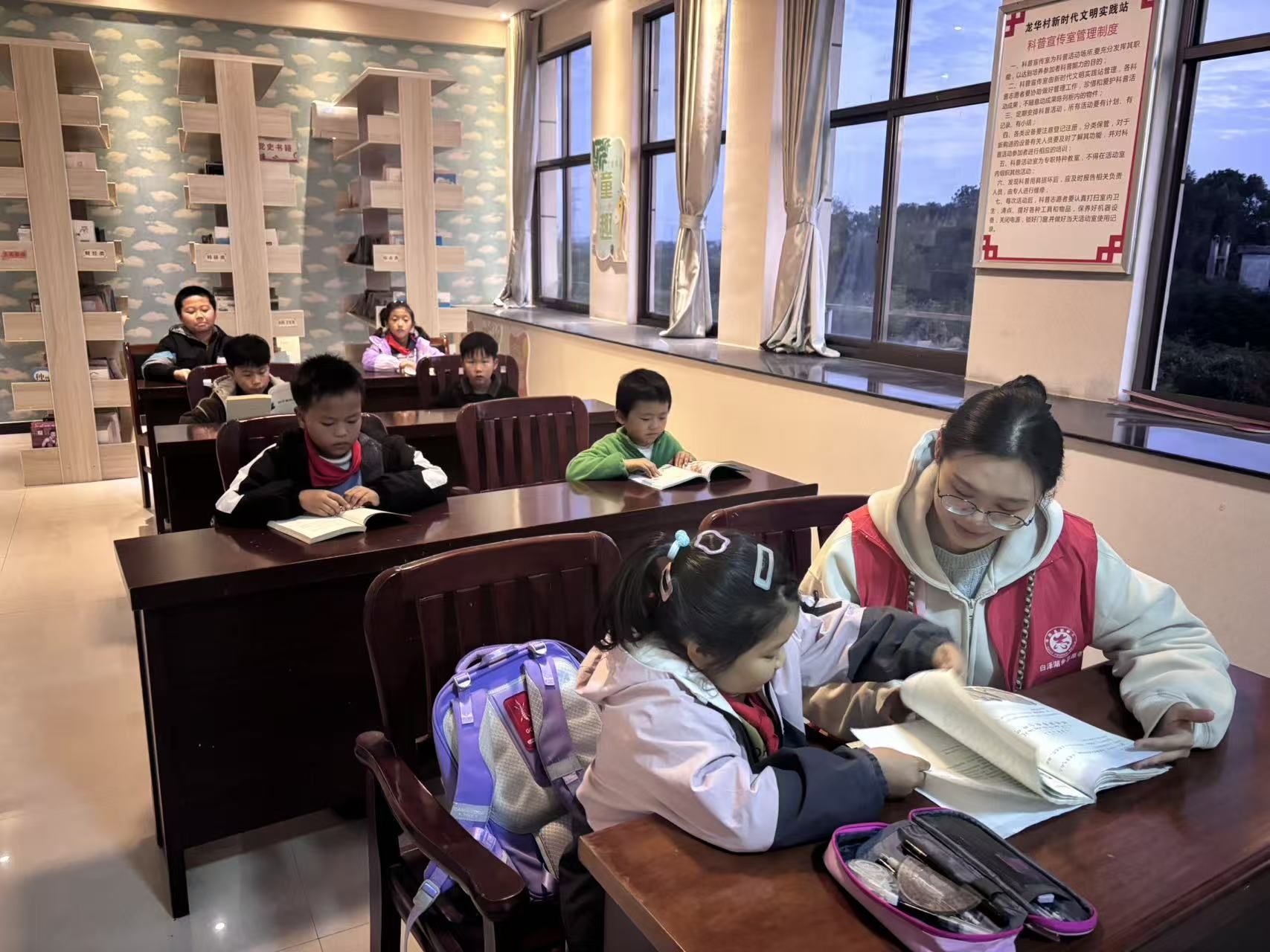 在关爱儿童成长方面,龙华村打造了“文化辅导+实践体验”的双重服务模式。村里充分利用农家书屋的资源优势,组织大学生志愿者组成服务队伍,定期开展公益阅读和课业辅导活动。每到周末和节假日,农家书屋就成了孩子们的“第二课堂”:志愿者们引导孩子们挑选喜爱的书籍,开展读书分享会,培养阅读兴趣;针对孩子们在学习中遇到的难题,志愿者们耐心讲解、悉心指导,帮助他们攻克学习难关。
