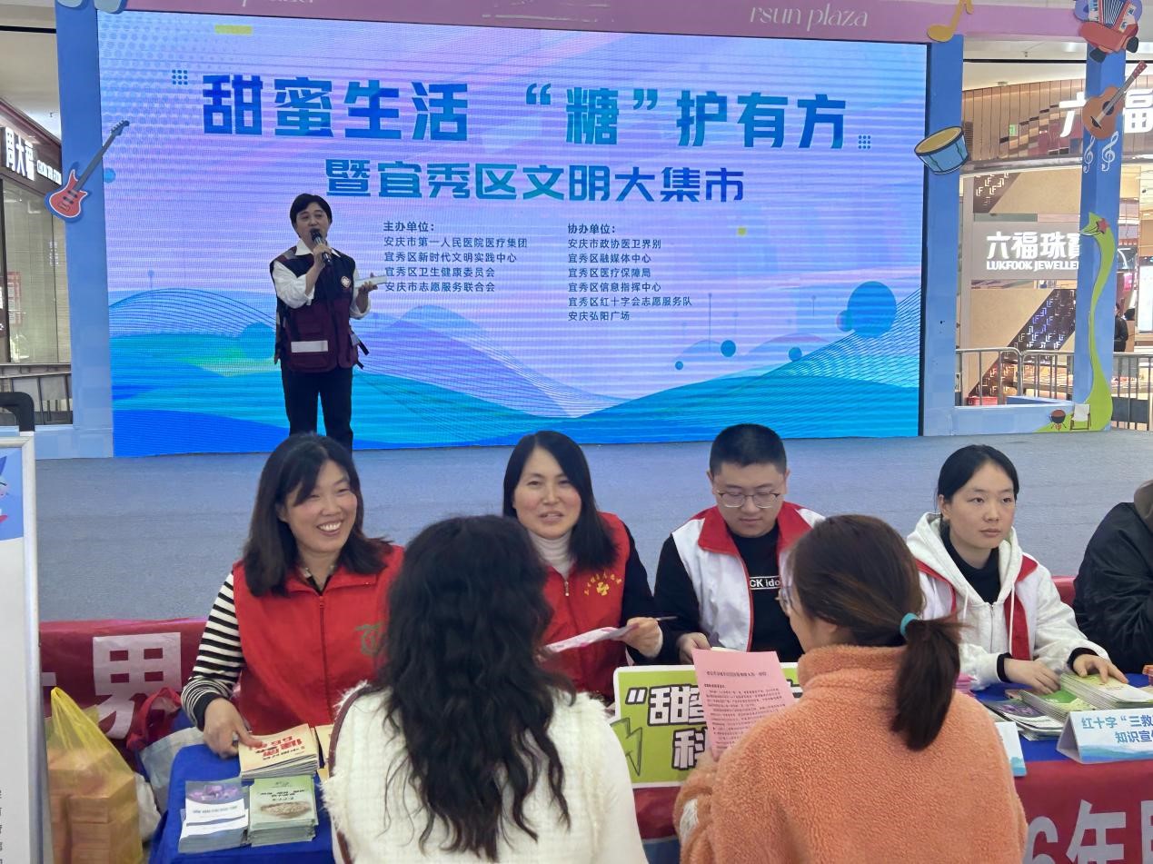 11月13日晚,安庆弘阳广场灯火璀璨、人声鼎沸,一场以"甜蜜生活”“糖”护有方为主题的宜秀区文明大集市活动圆满落下帷幕。本次活动由宜秀区卫健委联合安庆市第一人民医院医疗集团、宜秀区新时代文明实践中心等单位共同主办,宜秀区红十字会、宜秀区融媒体中心等多家单位鼎力协办,主要以糖尿病防治科普为核心,融合多元便民服务,为市民送上一场兼具健康关怀与文明熏陶的公益盛宴。