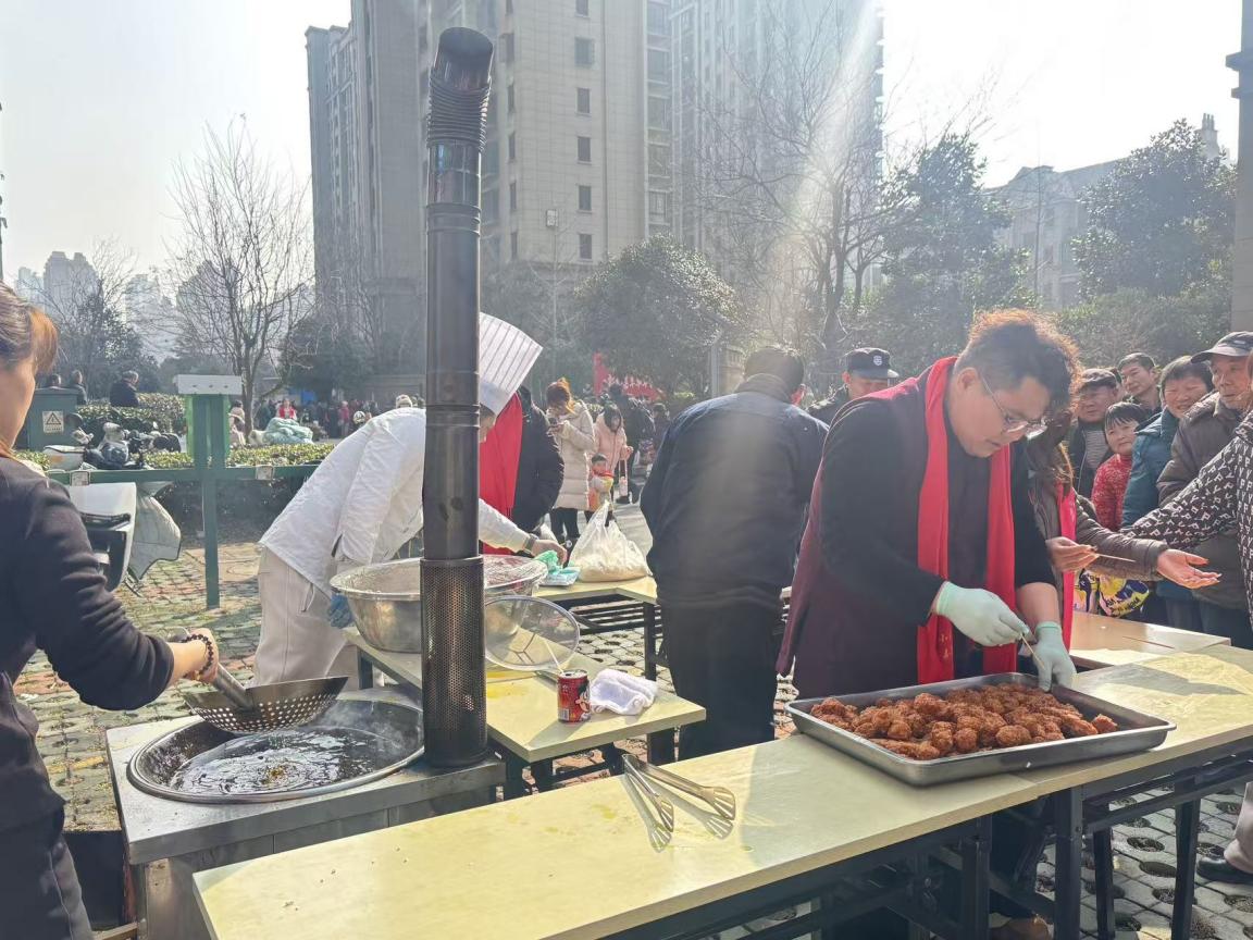 本次嘉年华设置民俗体验区、美食品尝区、便民服务区、新春赠礼区四大板块,内容丰富、形式多样,覆盖全年龄段居民需求。在民俗体验区,两位书法爱好者现场挥毫泼墨,将一句句吉祥祝福化作墨香满溢的春联与福字,免费赠予现场居民;在便民服务区,暖心义诊温情开启,家门口的健康服务触手可及,来自医疗机构的医护人员坐诊现场为每一位前来咨询的居民答疑解惑。美食品尝区秩序井然、氛围热烈,成为本次便民服务活动的人气亮点。厨师为居民准备了炸圆子,吸引众多居民群众有序排队品鉴。