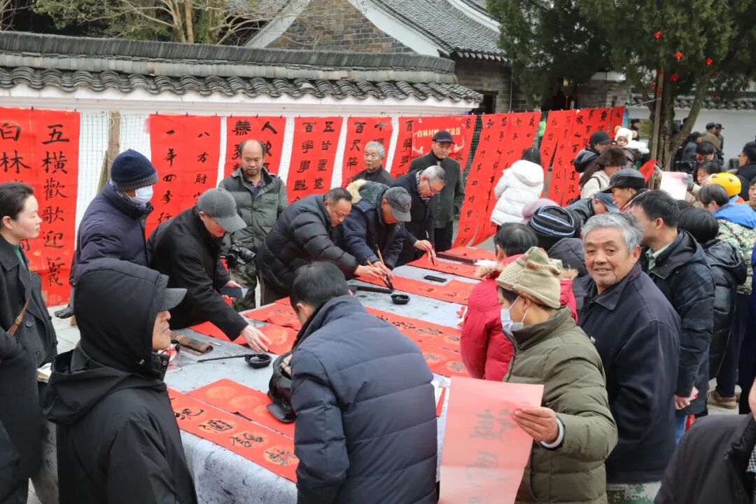 如果说文艺展演是红脉与乡风交融的文化盛宴,同步开设的特色体验区则是年味十足的乡土盛会。现场以“文化搭台、消费唱戏”为思路,打造沉浸式文化体验与农特产品展示空间,设置名家现场挥毫区、亲子书法体验角、书法作品展示区、国学书法展台、马年春联展台及市级非遗龙山剪纸展台,书法名家与国学师生铺纸研墨、挥毫送福,一个个饱满的“福”字、一副副蕴含时代新意的马年春联跃然纸上,尽显“书法之乡”深厚文化底蕴。