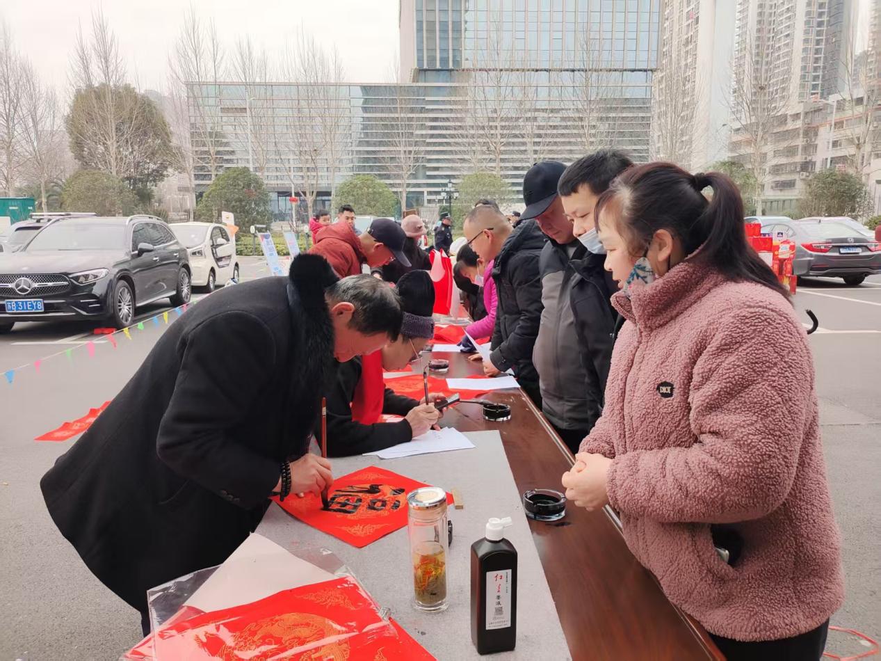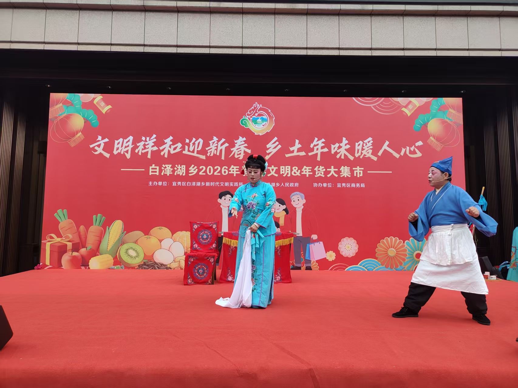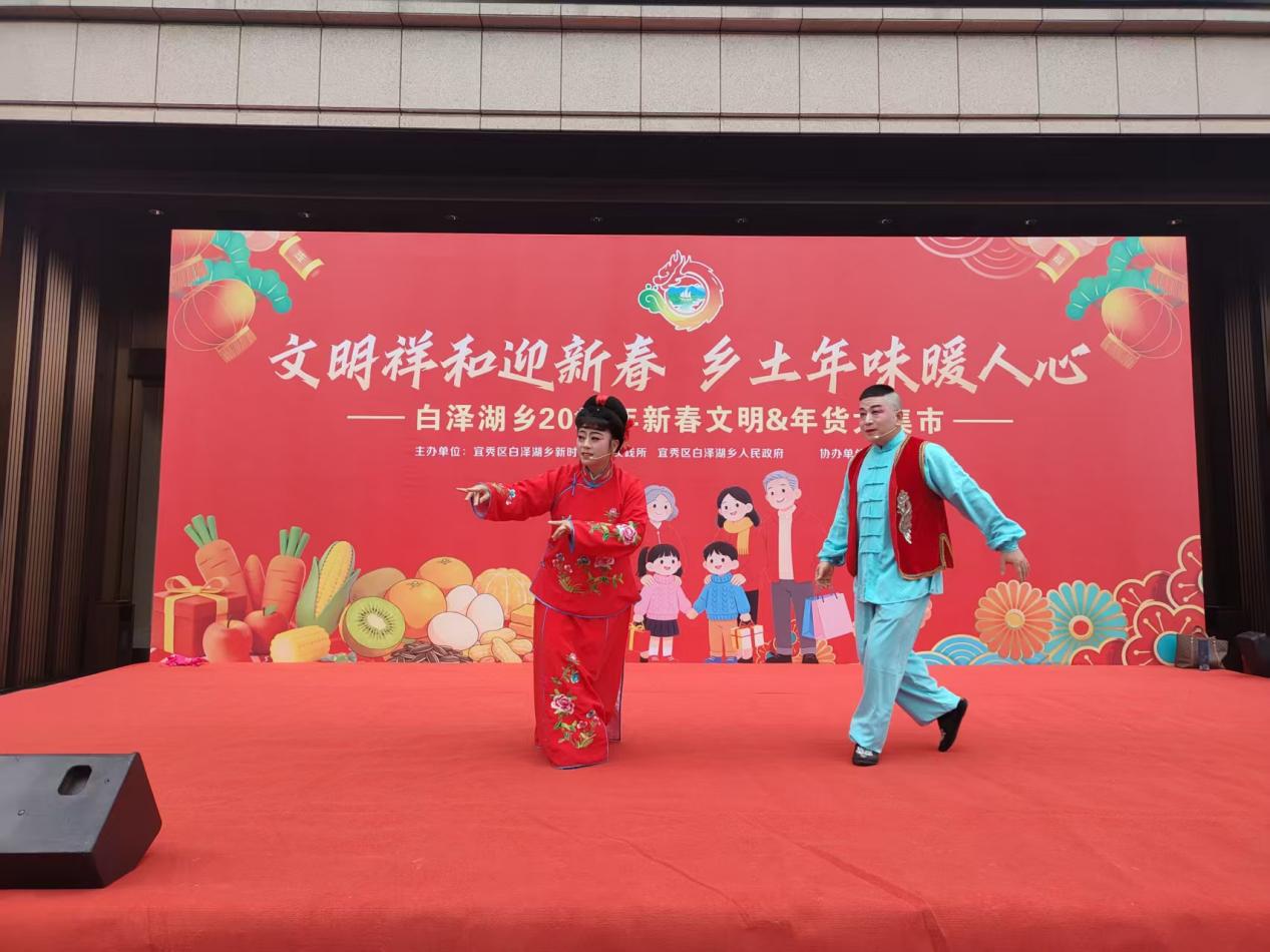 送春联、观大戏,节日气氛浓厚。在送春联区,“福”字斗方铺满长桌,书法家们铺纸蘸墨,将新春祝福凝于笔尖。火红的对联,淡淡的墨香,围观的居民纷纷“点单”。捧着墨迹未干的春联,王阿姨笑意盈盈:“手写的才有年味!”。与此同时,白泽湖乡本土黄梅戏剧团带来一场精彩纷呈的黄梅戏盛宴,表演了优秀精品黄梅戏剧目,让人大饱眼福。《闹花灯》《王小六打豆腐》《左牵男右牵女》等经典黄梅戏,引来了老年朋友们驻足观看,极大地丰富了人民群众文化生活。市民朱明轩说道,“集市上有戏看、有服务、有年货,热闹多了!”