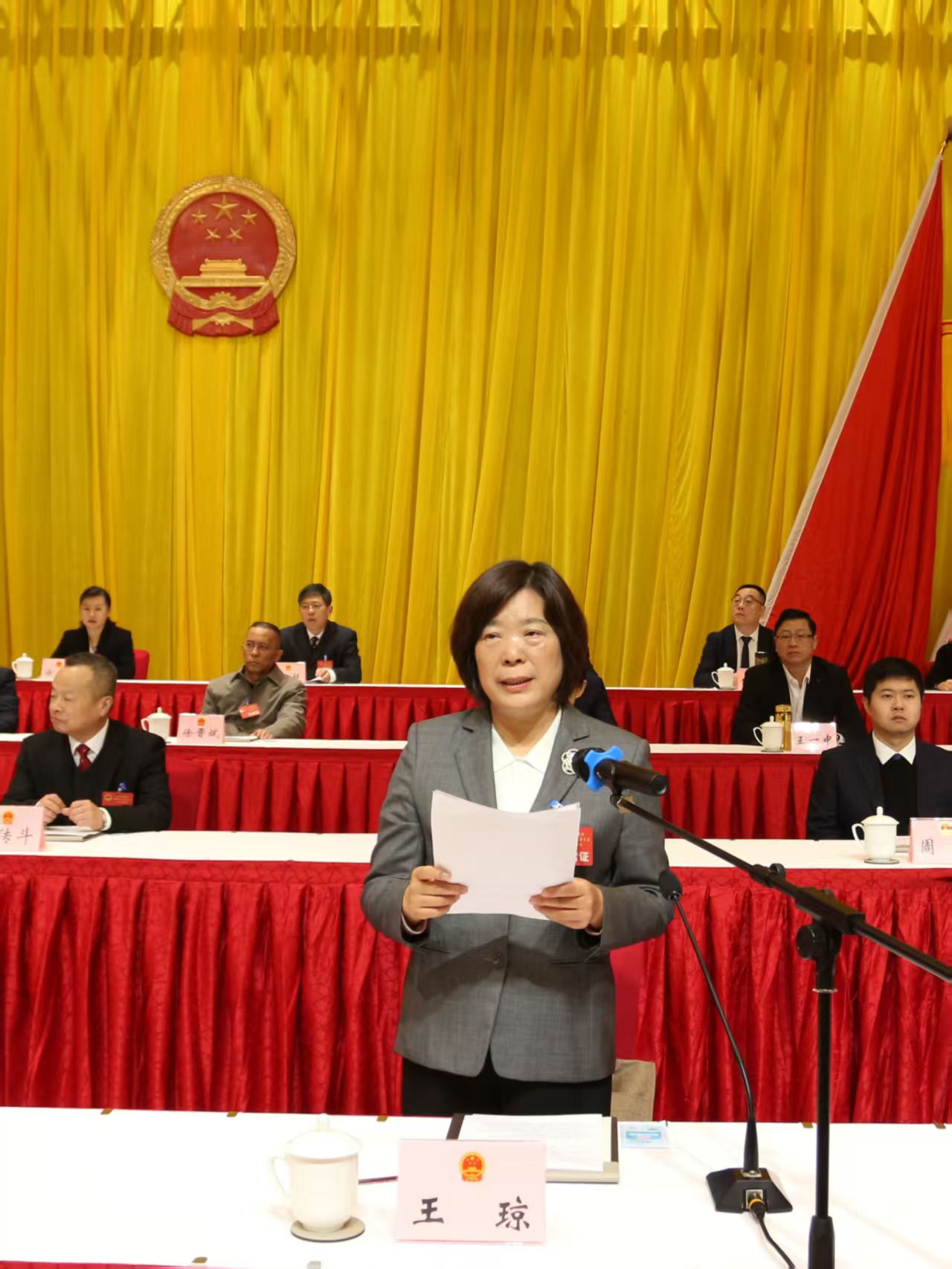 大会执行主席黄震、曹红斌、赵永杰、王琼、陈杰南、蒋卫东、徐永生、胡建华在主席台前排就座。区人大常委会副主任王琼主持大会。